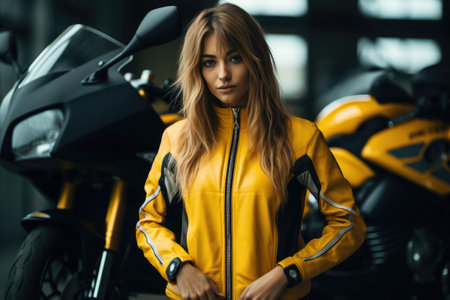 Young cool woman with long hair wearing motorcycle gear and helmet, yellow and black colors, AI Generated