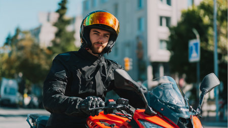 Motorcyclist in urban setting prepares for ride on sunny day with stylish helmet and black outfit