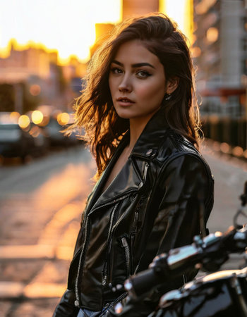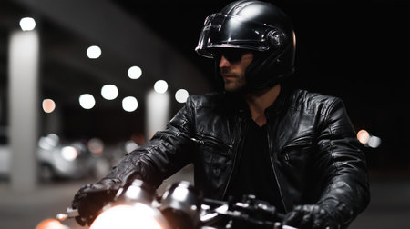Biker in black leather jacket rides through urban streets at night with a confident attitude and stylish gear