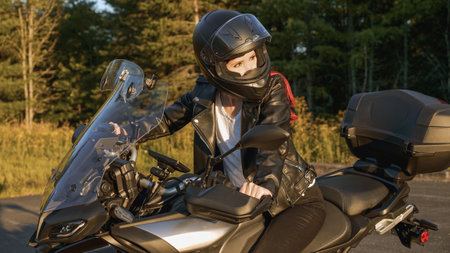 mature woman in motorbiker clothing riding a modern motorcycle outdoors