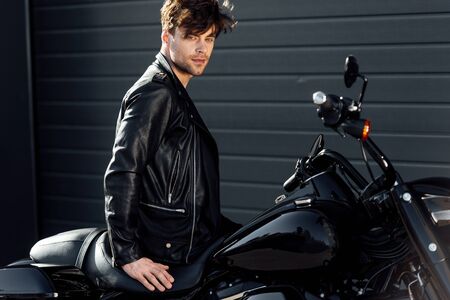 Attractive young man in a black leather jacket is sitting on a motorcycle on a city street.