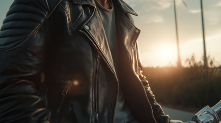 A rider in a leather jacket takes in the stunning sunset while seated on a motorcycle