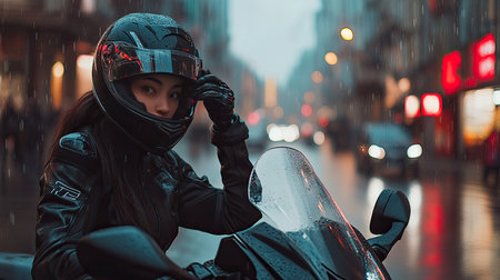 A motorcyclist wearing a brown leather jacket and a protective helmet rides through a rainy urban road. The wet weather adds a dramatic flair to the scene as raindrops splatter on his gear, highlighting his adventurous spirit.