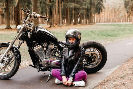 Young biker girl riding touring motorbike on forest road. Beautiful woman with red hair in leather jacket sitting on motorcycle in the park