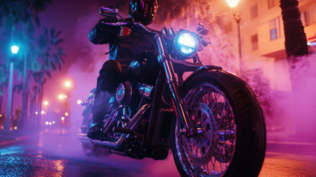 Motorcycle is bathed in pink light creating artistic and visually appealing effect. Generative AI.