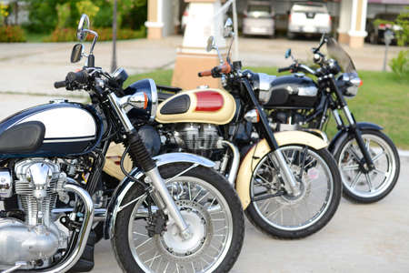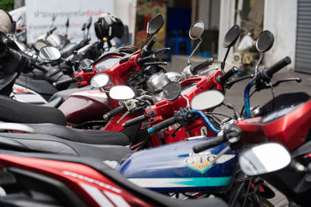 Motorbikes, motorcycles scooters parked in row in city street. Close up of details. Bikes