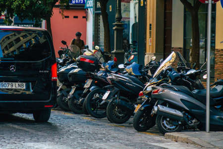 Seville Spain July 23, 2021 Scooters parked in the streets of Seville, an emblematic city and the capital of the region of Andalusia, in the south of Spain