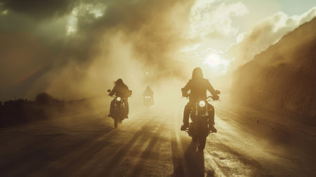 Motorcyclists riding at sunset on an open road. The concept speaks of freedom and adventure.