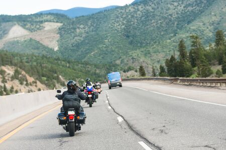 Group of motorbikes ride on interstate highway through mountain pass, Colorado United States