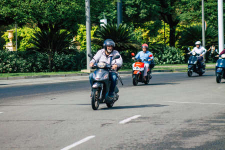 Seville Spain September 18, 2021 People rolling with a motorcycle in the streets of Seville, an emblematic city and the capital of the region of Andalusia, in the south of Spain
