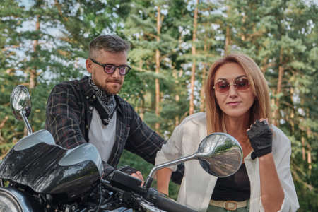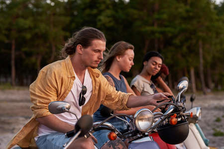 Handsome young guy, motorcycle rider sitting on his scooter while spending time together with his friends outside the city