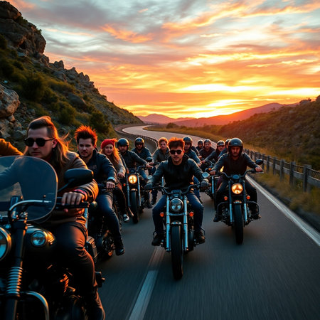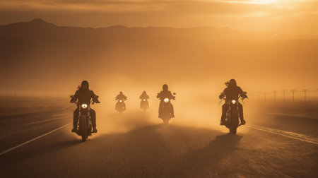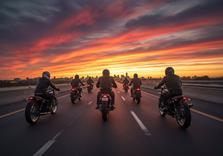A striking image of bikers riding into the sunset, creating powerful silhouettes against a warm evening sky. This scene captures the essence of freedom and adventure.