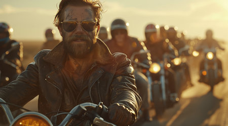 A man wearing a leather jacket and sunglasses rides a motorcycle with a group of friends on an open road at sunset.