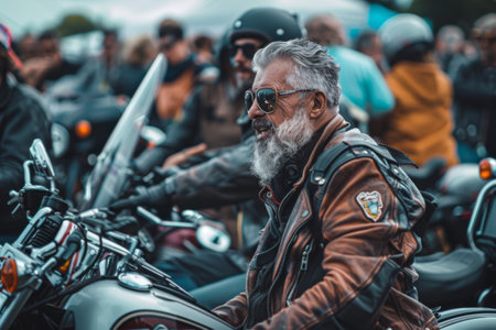 A group of motorcyclists shares camaraderie at a lively festival, with one man in a brown leather jacket and shades, radiating confidence and nostalgia as they embrace the thrill of the open road.