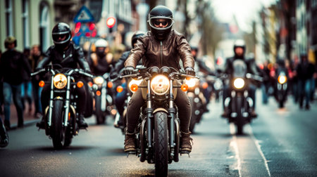 Multiple motorcycles with riders cruise down the street in formation, showcasing freedom, brotherhood, and road culture.