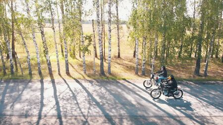 Two bikers are riding theis bikes on the road in the forest - aerial view