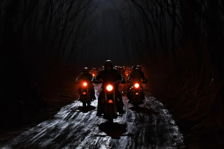 Motorcyclists on the road in the forest at night. Selective focus