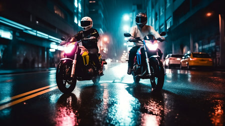 An AI generated illustration of two motorcyclists riding on a road against the backdrop of a city skyline