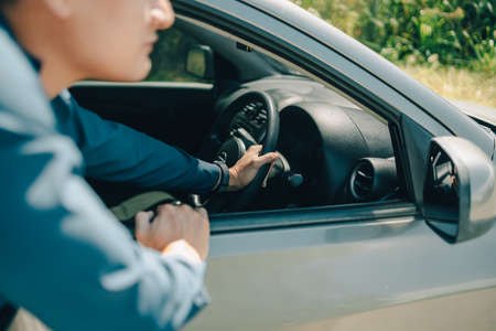 close up side view back view photo. man is sitting in the car and holding a steering wheel