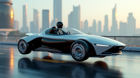 A sleek electric car speeds along a modern highway showcasing a dynamic design with a futuristic cityscape in the background illuminated by sunset hues.