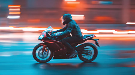 A thrilling dynamic shot of a motorcycle rider speeding along a scenic road. The blurred background creates a sense of motion, emphasizing adventure, freedom, and excitement in a stunning outdoor setting.