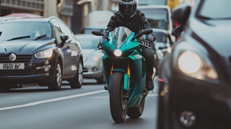 Motorcyclist on motorbike in traffic in Bucharest, Romania, 2022
