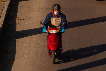 Georgia, Tbilisi - November 28, 2020: Man riding motorcycle on city road.