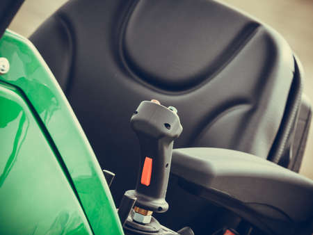 Detailed close up of gear stick in agricultural machine, big vehicle. Inside of truck trailer details concept.
