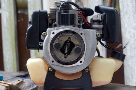 Engine of gasoline trimmer disassembled for service
