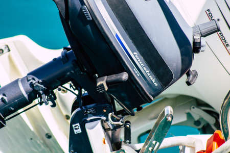 Limassol Cyprus March 24, 2020 Closeup of a motor of a boat moored in the marina of Limassol in Cyprus island