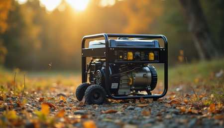 A portable generator placed outdoors on a ground covered with autumn leaves, set against a forest background.
