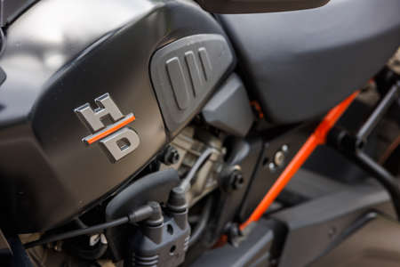 Harley-Davidson Pan America 1250 Motorcycle on asphalt parking at spring day, close view on logo