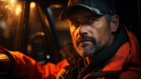 Portrait of Truck Driver in Front Truck extreme closeup. Generative AI