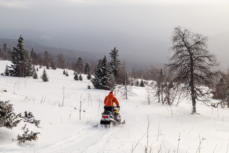 Athlete on a snowmobile moving in the winter forest in the mountains of the Southern Urals.