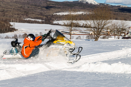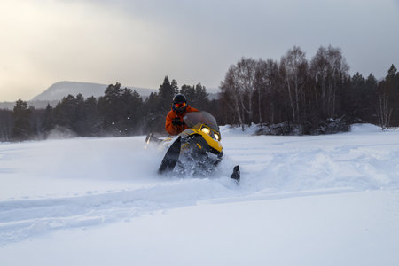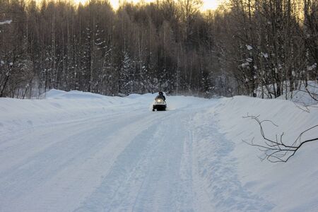 Snowmobile in winter conditions. Snowmobiling in winter in the north. Extreme kind of winter outdoor sport.