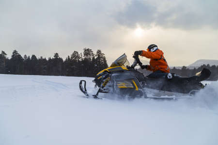 Athlete on a snowmobile moving in the mountains in winter