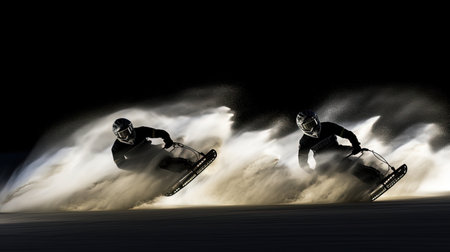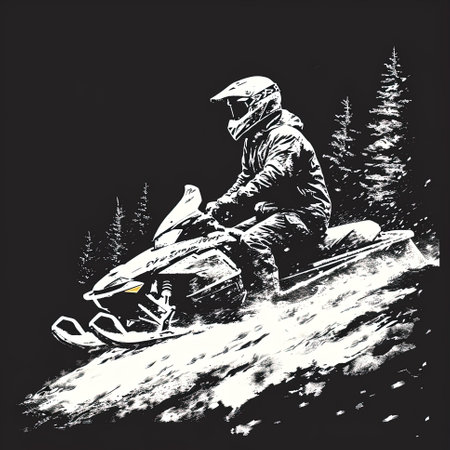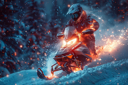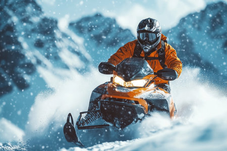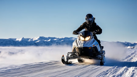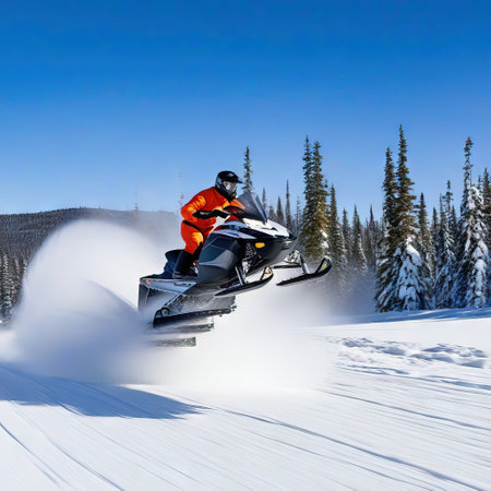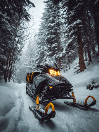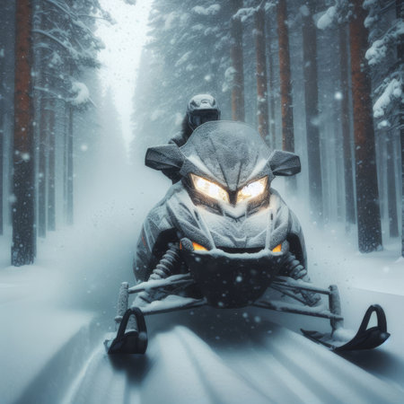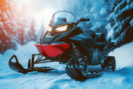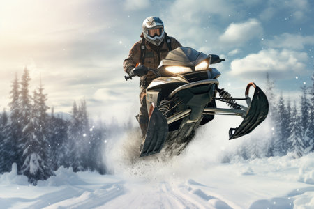 An exhilarating scene of a snowmobile navigating through snow in a winter landscape, showcasing the thrill of outdoor adventures and the beauty of nature.