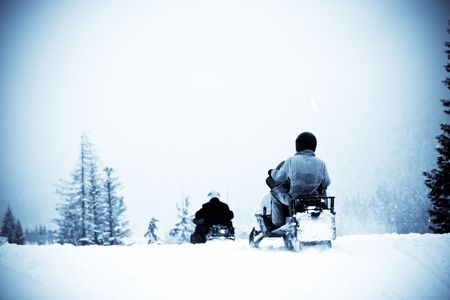 A shot of people riding snowmobile in the middle of winter snow storm, shot in blue tone.