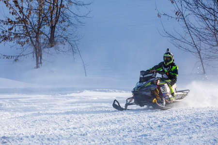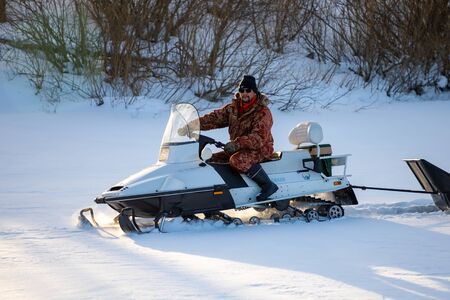 Kemerovo, Russia - 23.02.2019: Rider on the snowmobile in nature of Siberia in Russia