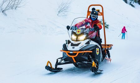 Bulgaria. Bansko. 12 February 2019.lifeguard man riding a snowmobile in the mountains. Medical worker to help the injured