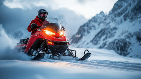 A motorist expertly maneuvers a red snowmobile across a snowy landscape surrounded by majestic mountains during winter twilight hours.
