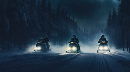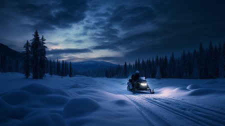 a stunning photo captured during the blue hour showcases the enchanting transformation of the natural landscape. snowmobiles add a touch of adventure to the minimalist scene, while the high-quality, 16k, hd image highlights every detail. shot with a canon 5d, this transparent photo immerses viewers in a magical wonderland. ai generated