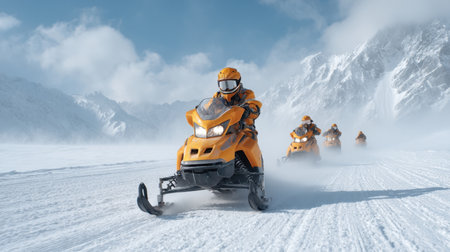 Experience the rush of snowmobiling as riders speed through a stunning snow-covered landscape, surrounded by majestic mountains and clear winter skies.