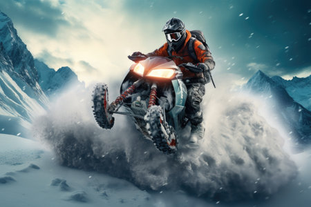 Motocross rider on the piste. Extreme motorcycle race, Extreme rider jumping with a snowmobile on the snow, face covered with a helmet, AI Generated