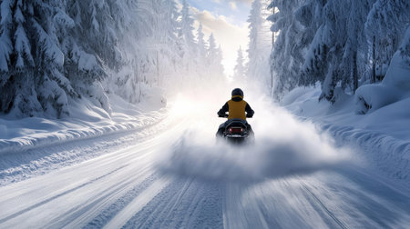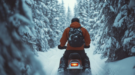 Winter adventure on a snowmobile through a snowy forest trail in a remote location