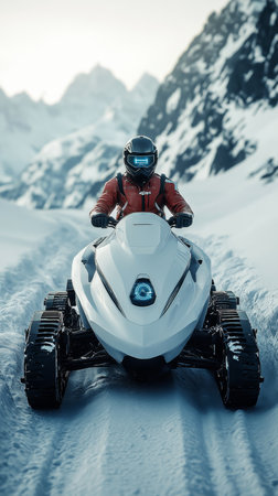 Snowmobile Adventure Rider Explores a Snowy Mountain Road, Winter Wonderland Exploration.