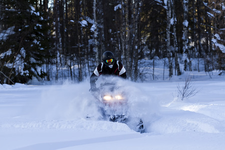 Snowmobile racer wearing a helmet and goggles is driving his snowmobile through deep powder snow in a forest