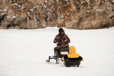 A man on a snowmobile is towing a sled with a child. winter entertainment outside the house