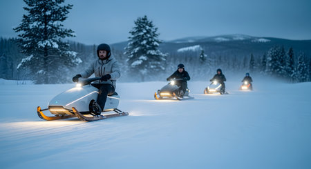 A group of snowmobilers glides swiftly over a pristine snow covered trail surrounded by tall evergreen trees. The sun sets in the background casting a golden hue across the landscape and illuminating the fresh powder. The riders dressed in winter gear enjoy the thrill of adventure as they navigate the winding path