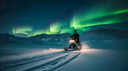Man rides a snowmobile against a backdrop of northern lights. AI-generated